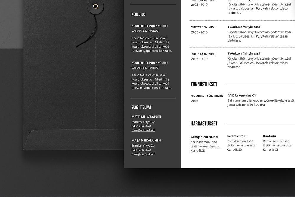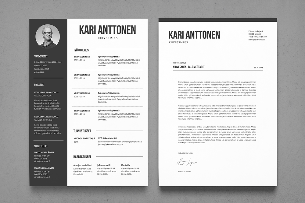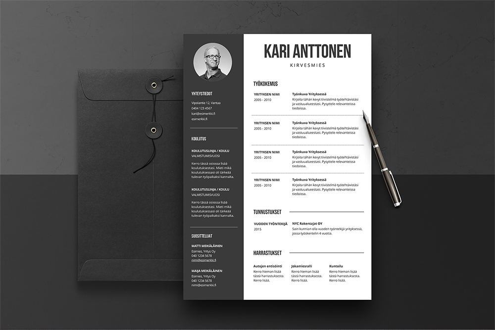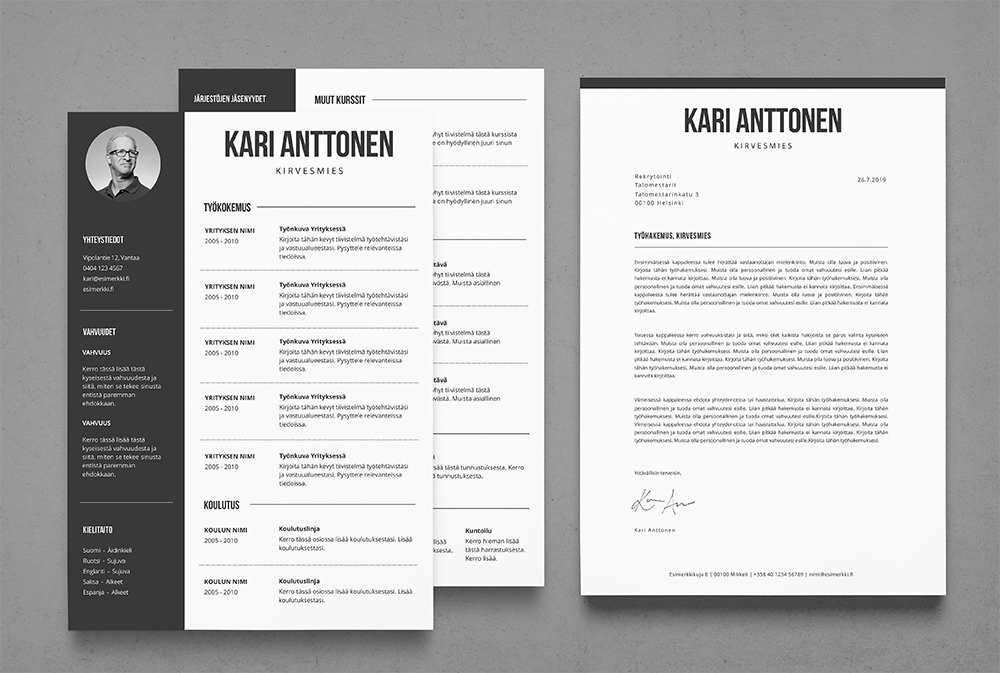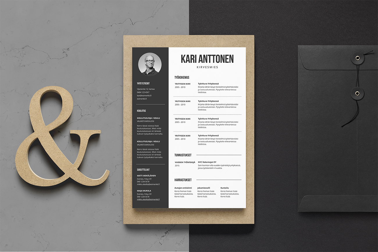 Kari on erinomainen valinta, kun haluat yhden CV-pohjan jota voi käyttää kaikkiin työhakemuksiin alasta riippumatta. Selkeä ja vahva design toimii mustavalkoisen värimaailman ansiosta erittäin hyvin myös tulostettuna.