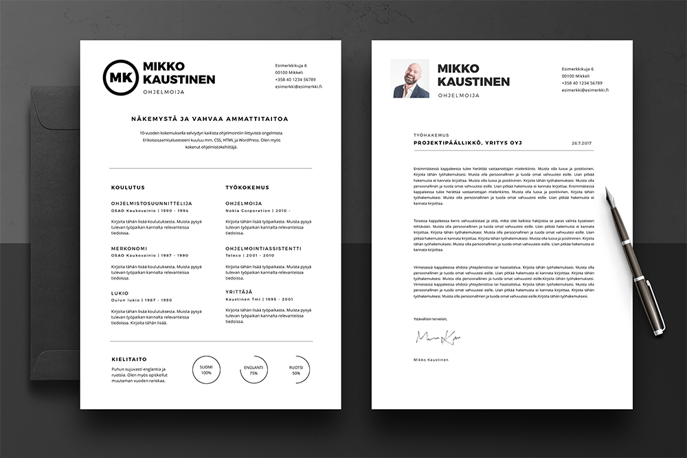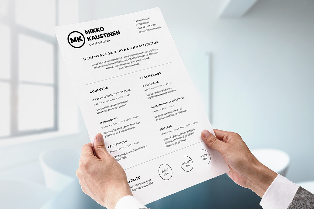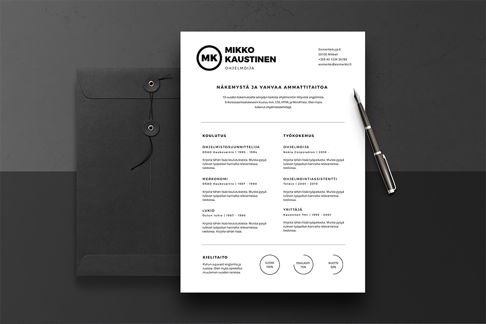 Mikko on minimalistinen ja aikaa kestävä pohja, jossa kielitaito on visuaalisesti ilmoitettu. Paikka valokuvalle on mukana tulevassa työhakemuspohjassa. Hyvä peruspohja jolla erotut muista hakijoista.